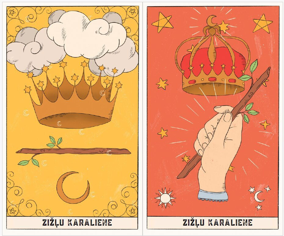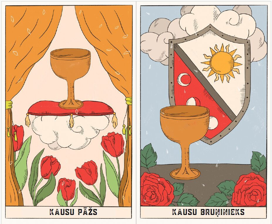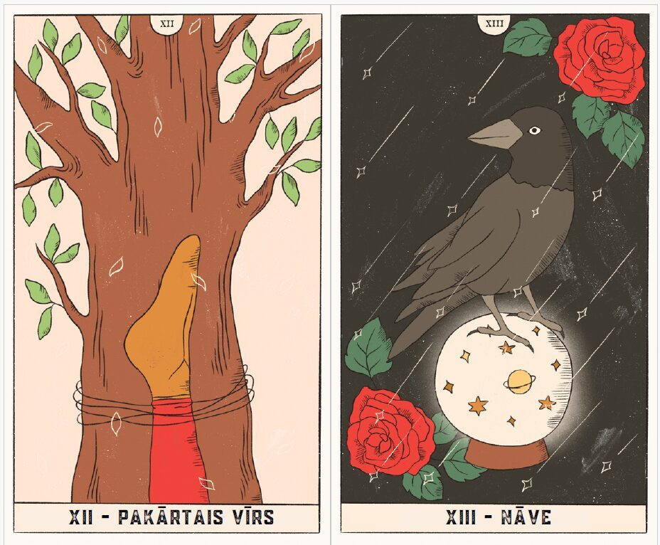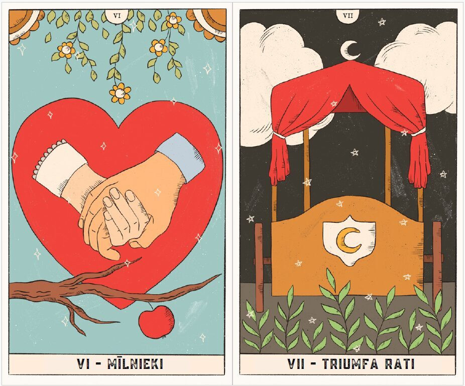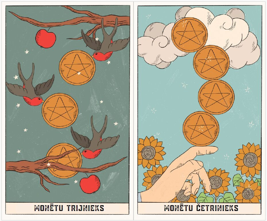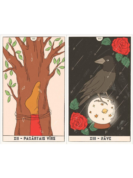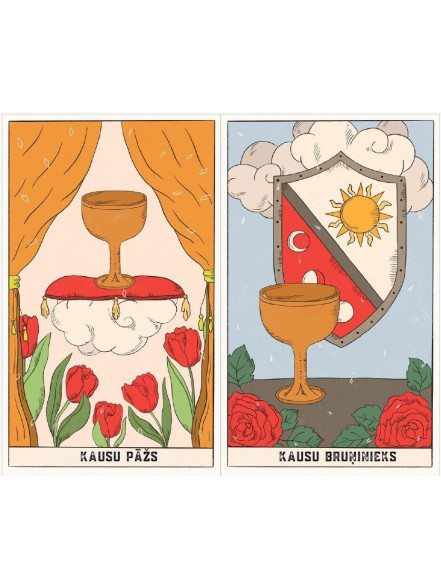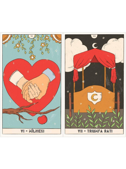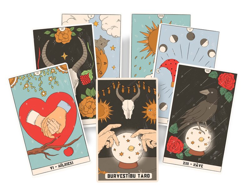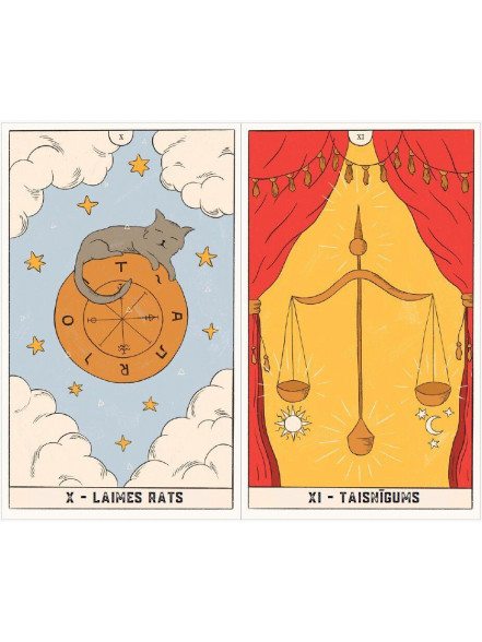 Taro kārtis ir iesaiņotas samta maisiņā. Drukātām kārtīm ir noapaļoti stūri.
