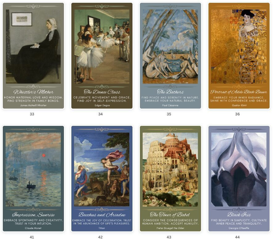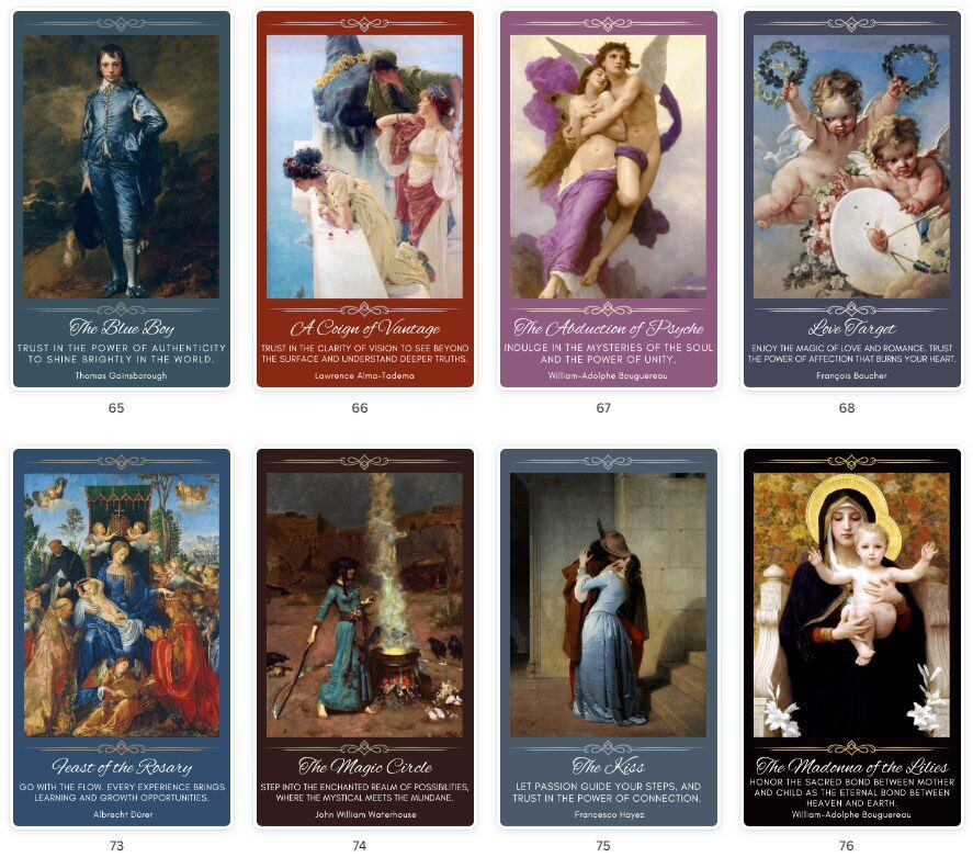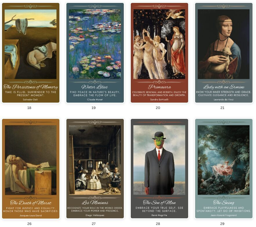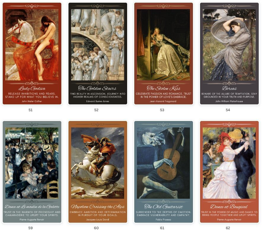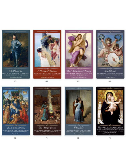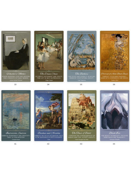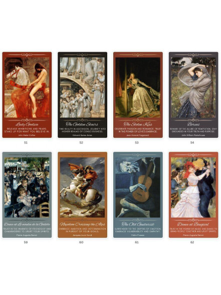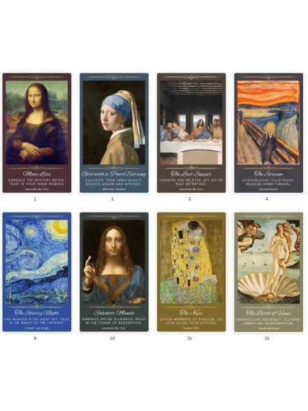 Mākslas Meistardarbu Orākuls ir unikāla kāršu kava, kas apvieno ikoniskus mākslas darbus un intuitīvo ceļvedi. Šis orākuls ir radīts, lai sniegtu iedvesmu un dziļākas atziņas, izmantojot pasaulē atzītu mākslinieku darbus. Katrs attēls ir izvēlēts, lai piedāvātu bagātīgu simboliku un emocionālu dziļumu, palīdzot jums iegūt skaidrību un izpratni dažādās dzīves jomās. Mākslas Meistardarbu Orākuls ir vairāk nekā tikai kāršu kava; tā ir vārti uz pasaules mākslas bagātībām un dvēseles dziļumiem. Izmantojot šo orākulu, jūs varēsiet izbaudīt lielo meistardarbu skaistumu un saņemt vērtīgas atziņas, kas palīdzēs jūsu personīgajā izaugsmē un dzīves ceļā. Lai katra kārts atklāj jums jaunas perspektīvas un iedvesmo jūs uz lieliem sasniegumiem.