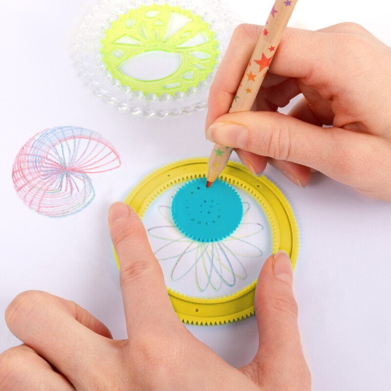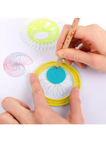 Klasiska zīmēšanas tehnika jaunā veidolā! Ievieto rāmītī kādu no izvēlētajiem zobratiem un pēc tam, zīmējot apļus, viegli izveidosies spirāļu formas. Radošums bez robežām! Izmēģini apvienot dažādas krāsas zīmējumus un rakstus, izveidojot neparastas mandalas! Komplektā ietilpst 2 spirāļu zīmēšanas instrumenti ar 3 dažādu izmēru zobratiem. Aptuvenais izmērs: Ø 8.9 cm.
