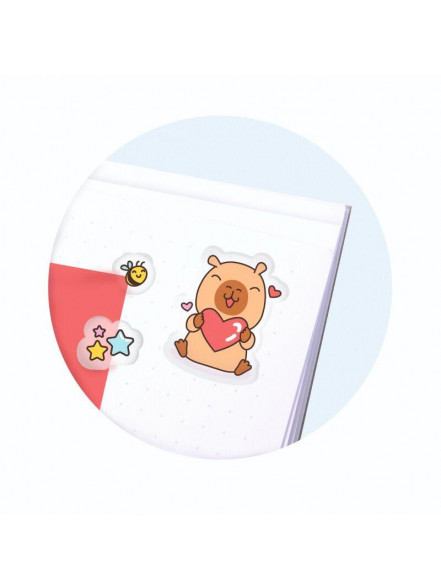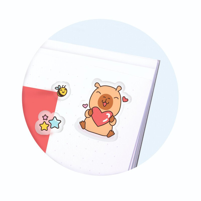 "Capybara Happy Life" - kolekcija, kas pieejama tikai ierobežotos daudzumos! 26 dažādu formu uzlīmes ar kapibaru attēliem. Caurspīdīgā pamatne un nedaudz piepaceltā virsma padara šīs uzlīmes īpaši skaistas - tās iekļausies uz dažādu krāsu foniem un lieliski papildinās ikdienas pierakstus! Uzlīmju lapas aptuvenais izmērs: 9 x 12.2 cm. Brīdinājums! Nav piemērots bērniem, kas jaunāki par trim gadiem, satur sīkas detaļas, pastāv aizrīšanās risks. Vēlams lietot pieaugušo uzraudzībā. Saglabājiet šo brīdinājumu informāciju! Izcelsmes valsts: Ķ.T.R. Uzmanību! Cena norādīta par vienu uzlīmju komplektu. Pieejami 3 dažādi dizaini: Mīlestība (uz vāciņa sirsniņas), Jautrība (uz vāciņa kapibara attēlota aktīvi atpūšoties) un Draugi (kapibara ar dzelteno putniņu, vardi un saldējumu). Veicot pasūtījumu, norādiet, kuru no dizainiem izvēlaties. Daži no dizainiem var būt izpārdoti.