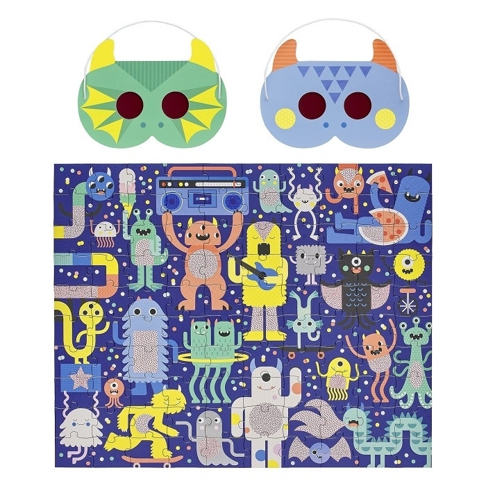 Šī puzle nu gan kādam sagādās neviltotu prieku, jo tā nav vienkārši 100 gabaliņu puzle ar raibu raibo monstriņu traci. Uzliekot kādu no maskām, kas iekļautas komplektā, ieraudzīsiet apslēptus attēlus saliktajā puzlē. Puzles un iesaiņojums izgatavoti no FSC sertificēta kartona un apdrukāti ar augu izcelsmes netoksiskām krāsām.
