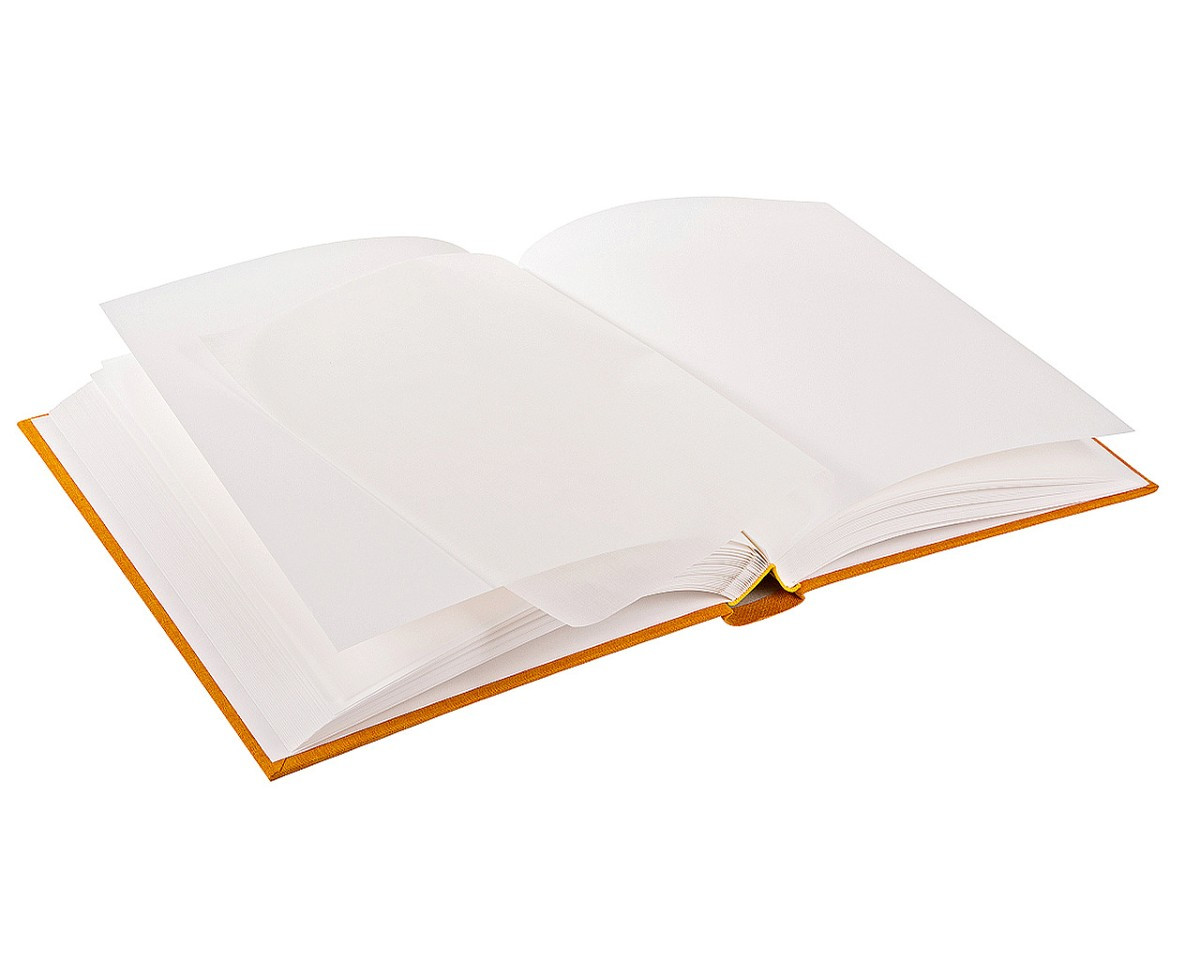 Luxurious classic photo album with sewn binding (book bound); white paper sheets with parchment between pages. The size of the pages is 23.7 x 24 cm and the size of the album is 25 x 25 cm. On the surface there is a single-colored textile cover (linen). The color is yellow with an orange tint. The photo album has 60 pages, photos are inserted using photo stickers or photo cones, or are glued with special glue or double-sided adhesive tape. You can find these aids in the Accessories section. The album can fit approximately 180 photos 9x13 cm, possibly 120 photos 10x15 cm or 60 photos 13x18 ev. 120 photos 11x17/10x18 cm. The larger "brothers" have dimensions of 30x31 cm and 34x35 cm.