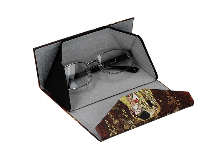 Salokāms briļļu futrālis, kas dekorēts ar motīvu no Gustava Klimta gleznas "Skūpsts".