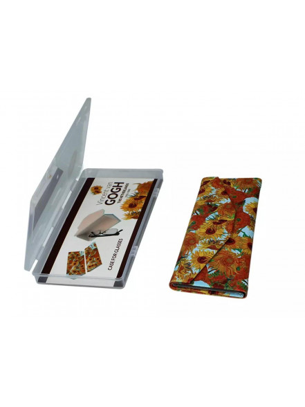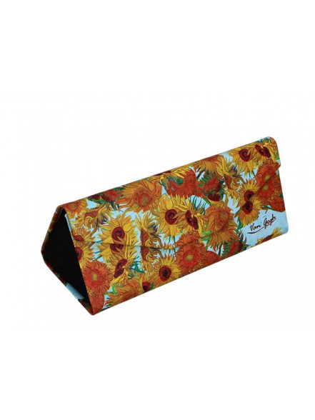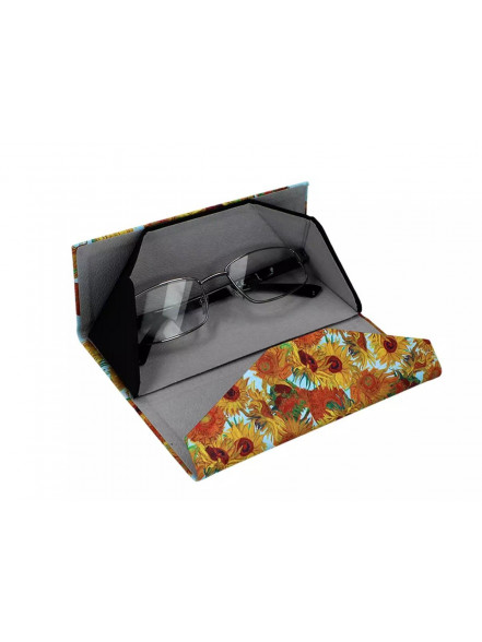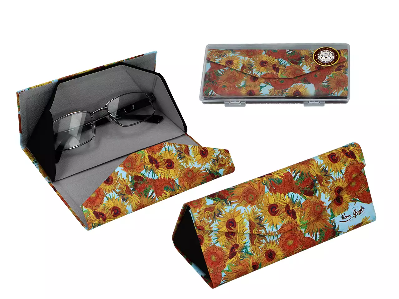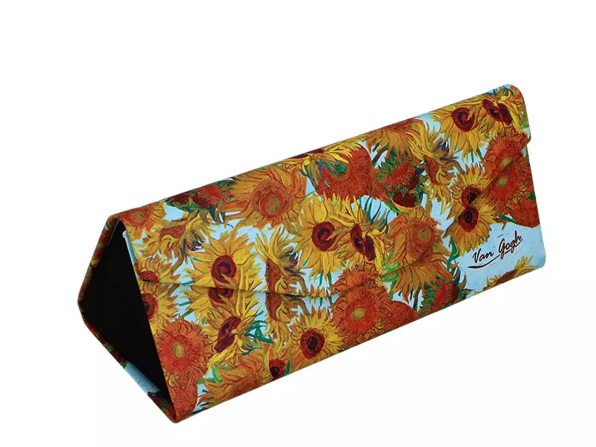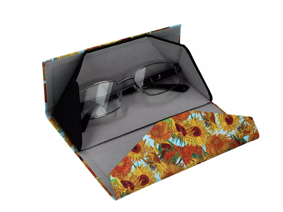 Salokāms briļļu futrālis, kas dekorēts ar motīvu no Vinsenta Van Goga gleznas "Saulespuķes".