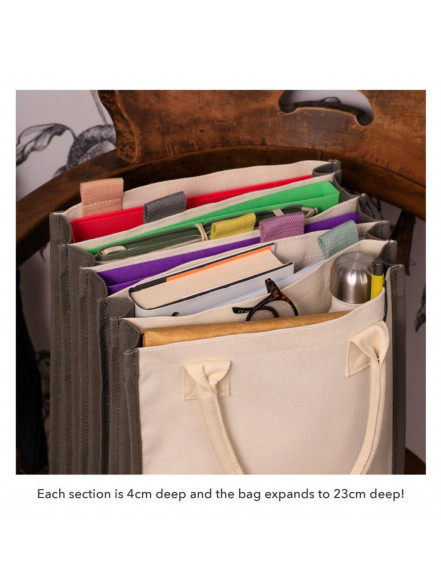 Viena soma - piecas atsevišķas sekcijas. 100% kokvilna - izturīgs materiāls ar izturīgiem rokturiem. Der A4 mapēm. Katra sekcija ir 4 cm dziļa, kad tā ir pilnībā atvērta. Izcils radījums skolotājiem, studentiem vai cilvēkiem, kuriem ir daudz darāmā!