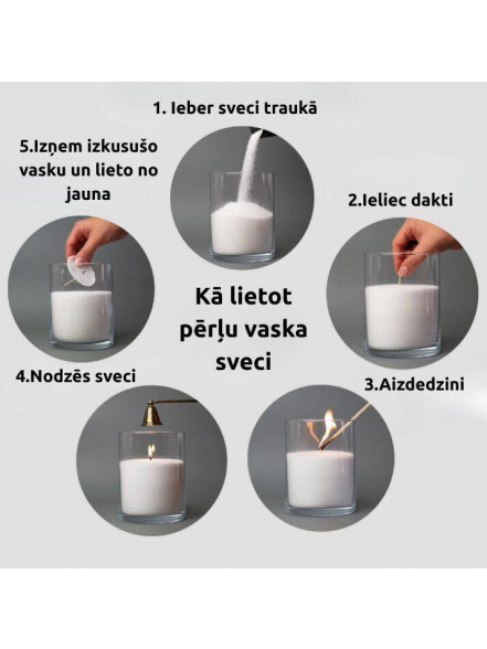 Lietošana ir ļoti vienkārša – ieberiet pērļu vasku stikla vai kādā citā traukā, ievietojiet dakti un aizdedziniet.