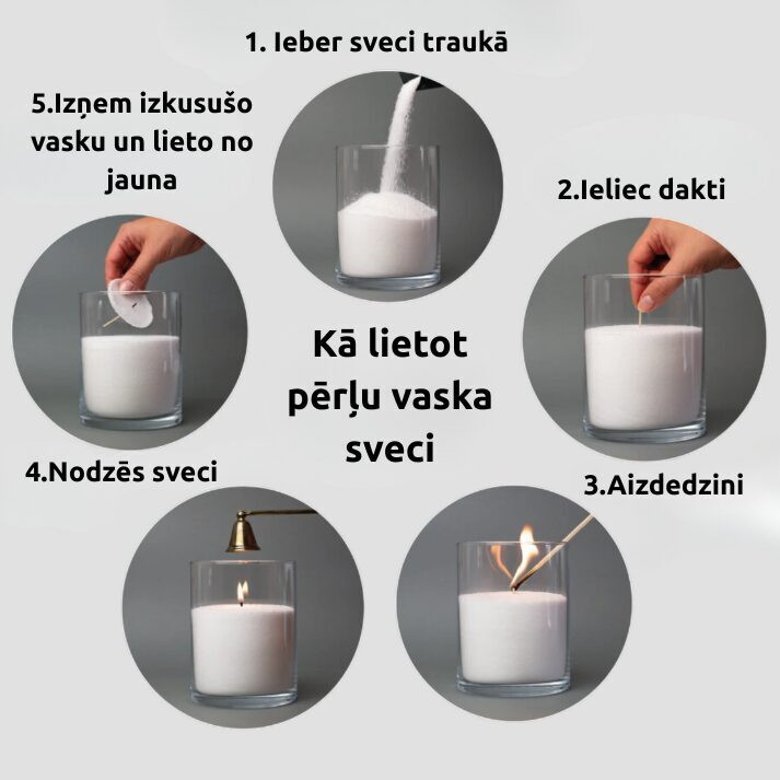 Lietošana ir ļoti vienkārša – ieberiet pērļu vasku stikla vai kādā citā traukā, ievietojiet dakti un aizdedziniet.