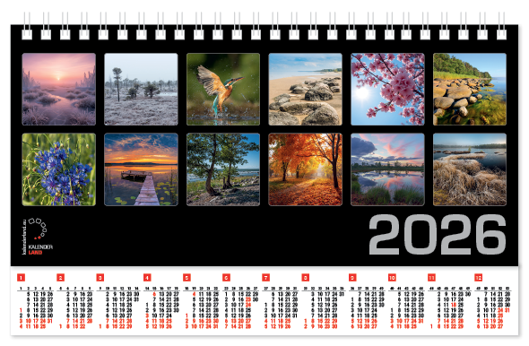 Galda kalendārs 2025.gadam ar skaistām dabas ainavu fotogrāfijām.