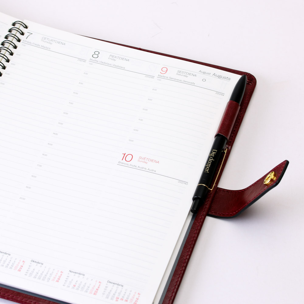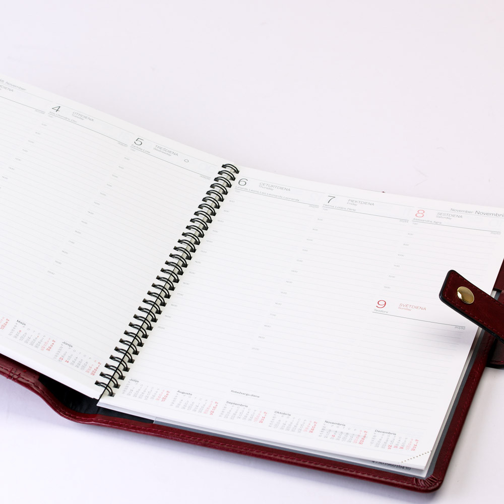 ADVOCATE plānotājs ir piemērots cilvēkiem ar saspringtu grafiku, jo diena ir sadalīta ik pa stundai. Atvērumā ir redzama visa nedēļa, kā arī neliels visa gada kalendārs. Pateicoties stūru perforācijai plānotāja lietošana ir īpaši ērta. Lieto apvākus gadu no gada, mainot vien kalendāro daļu jeb iekšiņu.
