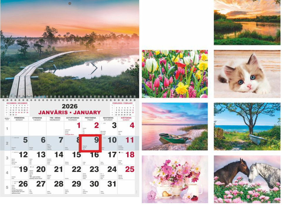 Atvērumā redzams izvēlētais mēnesis, iepriekšējais mēnesis un nākošais mēnesis. Kalendārā atzīmētas vārda dienas, svētku un atceres dienas, mēness fāzes, norādīta nedēļu numerācija. Mēnešu un nedēļas dienu nosaukumi norādīti latviešu un angļu valodās. Pievienots pārbīdāms datumu rādītājs. Pieejami dažādi attēli. Atvēruma izmērs: 42 x 29.7 cm.