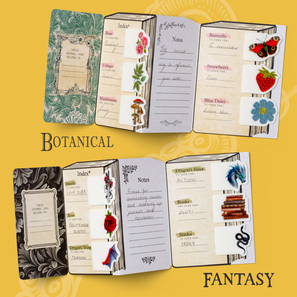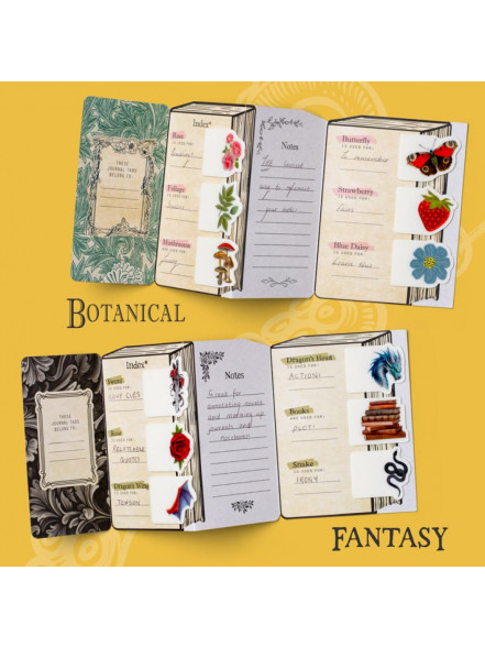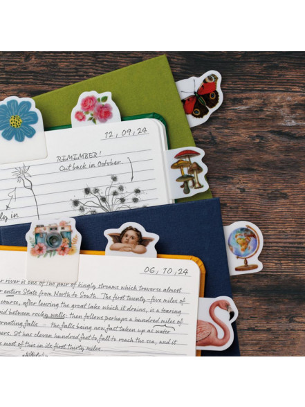 Savdabīgs veids, kā izrotāt un anotēt savas grāmatas un piezīmju grāmatas. Izvēlieties labās daļas, iezīmējiet svarīgās lapas, atcerieties citātus. Vai vienkārši savu piezīmju grāmatiņu vai romānu. Gudrs iepakojums (ar vietu, kur atsaukties uz katru no sešām cilnēm) stāvēs arī uz jūsu galda. Savdabīgs un eklektisks.