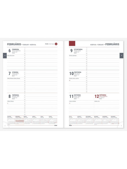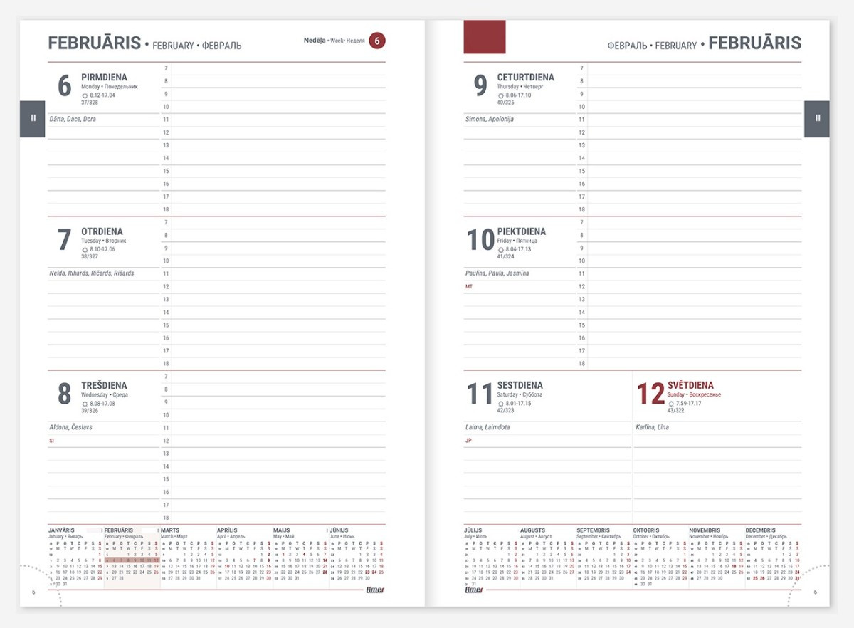 Izmērs: 15.5 x 21.5 cm Lapas izmērs: 14.8 x 21.0 cm Valodas: Latviešu, angļu un krievu Papildinformācija: Krāsaini, polsterēti kartona vāki, grāmatzīme, cietais sējums, perforēti noplēšami lapu stūrīši Papildus apdrukas iespējas: Nav iespējams apdrukāt Apraksts: Visās A5 formāta dienasgrāmatās ir tabulas kalendārs, gada plāns, nedēļu numerācija, valsts svētku un atzīmējamās dienas, karogu dienas, vārda dienas, 38 citu valstu svētku dienas, norādīta pāreja uz vasaras un ziemas laiku, gadalaiku sākums, saullēkta un saulrieta laiki, mēness fāzes, zodiaka zīmju maiņas dienas, kontaktu un piezīmju lapas.