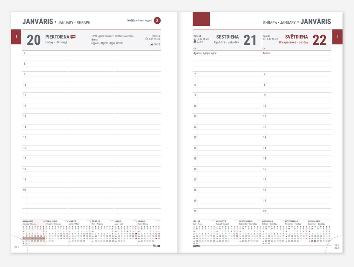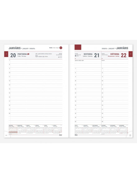 Izmērs: 15.5 x 21.5 cm Lapas izmērs: 14.8 x 21.0 cm Valodas: Latviešu, angļu un krievu Papildus informācija: Polsterēti lederīna vāki, grāmatzīme, cietais sējums, perforēti noplēšami lapu stūrīši Papildus apdrukas iespējas: Zeltīti vai sudraboti stūrīši, logo un/vai vārda uzspiedums Apraksts: Visās A5 formāta dienasgrāmatās ir tabulas kalendārs, gada plāns, nedēļu numerācija, valsts svētku un atzīmējamās dienas, karogu dienas, vārda dienas, 38 citu valstu svētku dienas, norādīta pāreja uz vasaras un ziemas laiku, gadalaiku sākums, saullēkta un saulrieta laiki, mēness fāzes, zodiaka zīmju maiņas dienas, kontaktu un piezīmju lapas. Krāsas: Melns Tumši zils Bordo Tumši zaļš