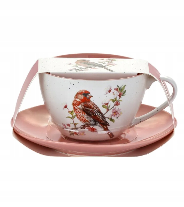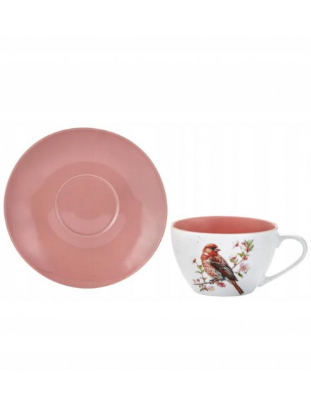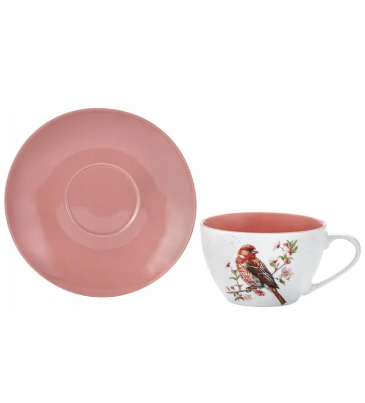 Ienesiet savā virtuvē dabas un elegances pieskārienu! Šī jaukā 300 ml apakštasīte ir ideāls smalka stila un funkcionalitātes sajaukums. Kausa ārpusē ir smalks putna motīvs, kas sēž uz ziedoša zara, kas piešķir siltumu un šarmu visam. Krūzes un apakštasītes iekšpusē ir moderna, rozā krāsa, piešķirot tai unikālu raksturu.