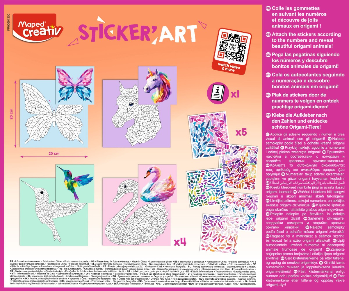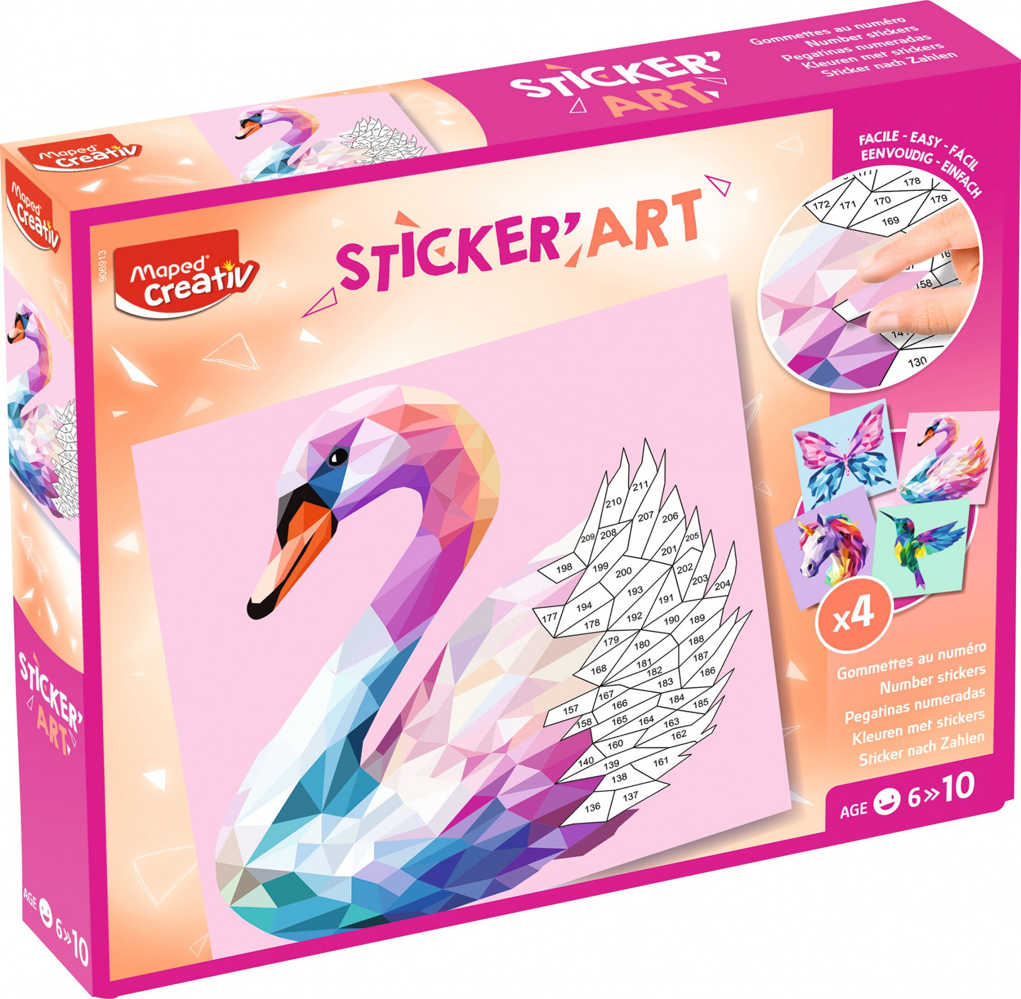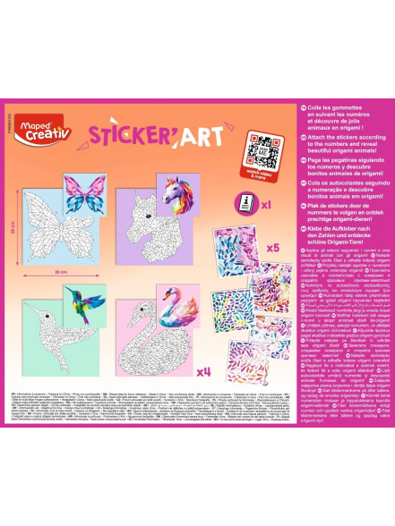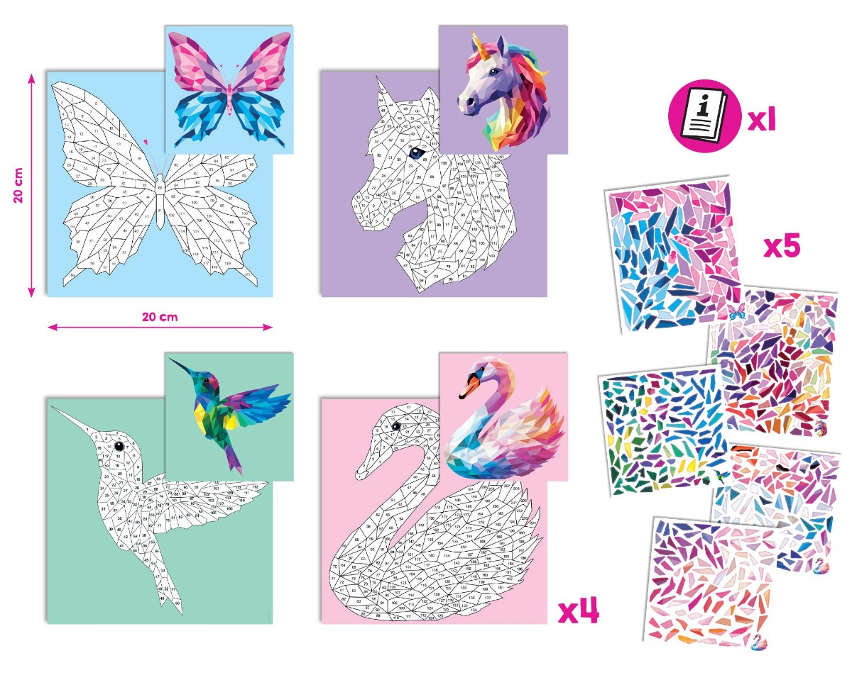 Komplekts satur 4 kartes (20 x 20 cm) ar dzīvnieku attēliem - tauriņš, kolibri, vienradzis un gulbis - un vairāk nekā 600 numurētu uzlīmju. Katru karti bērns pabeidz, sekojot uzlīmju numuriem, radot vienmēr iespaidīgu rezultātu.