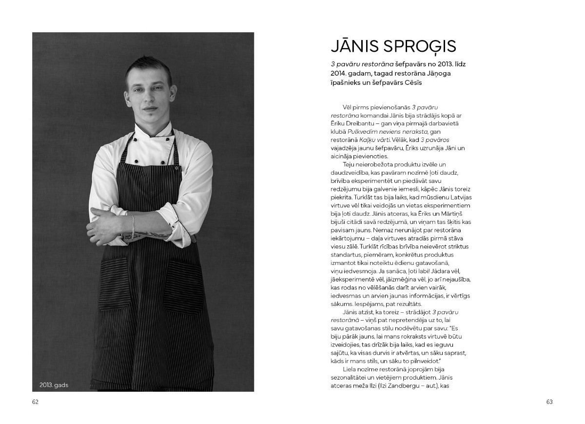Grāmata stāsta par vienu no pazīstamākajiem Rīgas restorāniem – 3 pavāru restorānu –, kas tika atvērts 2011. gada septembrī Jēkaba kazarmās. Tas bija laiks, kad restorānu kultūra pasaulē strauji mainījās – Noma Kopenhāgenā bija kļuvusi par pasaules labāko restorānu, ēdienkartē atspoguļot produktu sezonalitāti un izvēloties tādas sastāvdaļas un produktus, kas raksturīgas Ziemeļvalstu klimatam un ainavām. To pašu Rīgā aizsāka 3 pavāru restorāns, tā kardināli mainot vietējo restorānu piedāvājumu un laužot priekšstatus par restorānu kultūru. 2024. gadā tas vainagojās ar pasaules restorānu ceļveža Michelin atzinību.