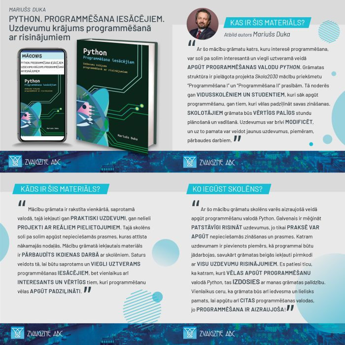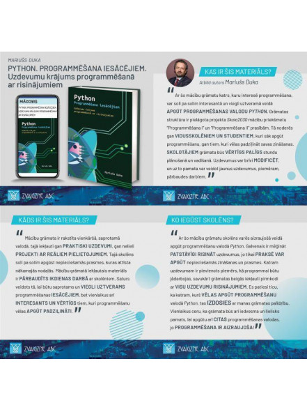 Kā to apgūt? Vislabāk – praktiski darbojoties, tāpēc šajā uzdevumu krājumā ir iekļauti gan vienkārši uzdevumi iesācējiem, gan sarežģītāki uzdevumi, kuru risināšanai nepieciešamas padziļinātas zināšanas. Pārbaudīt savu veikumu vai izmēģināt dotās programmas varēsi, izmantojot uzdevumu risinājumu pirmkodus, kuri visiem grāmatā dotajiem uzdevumiem atrodami grāmatas beigās un grāmatas elektroniskajā papildsaturā.