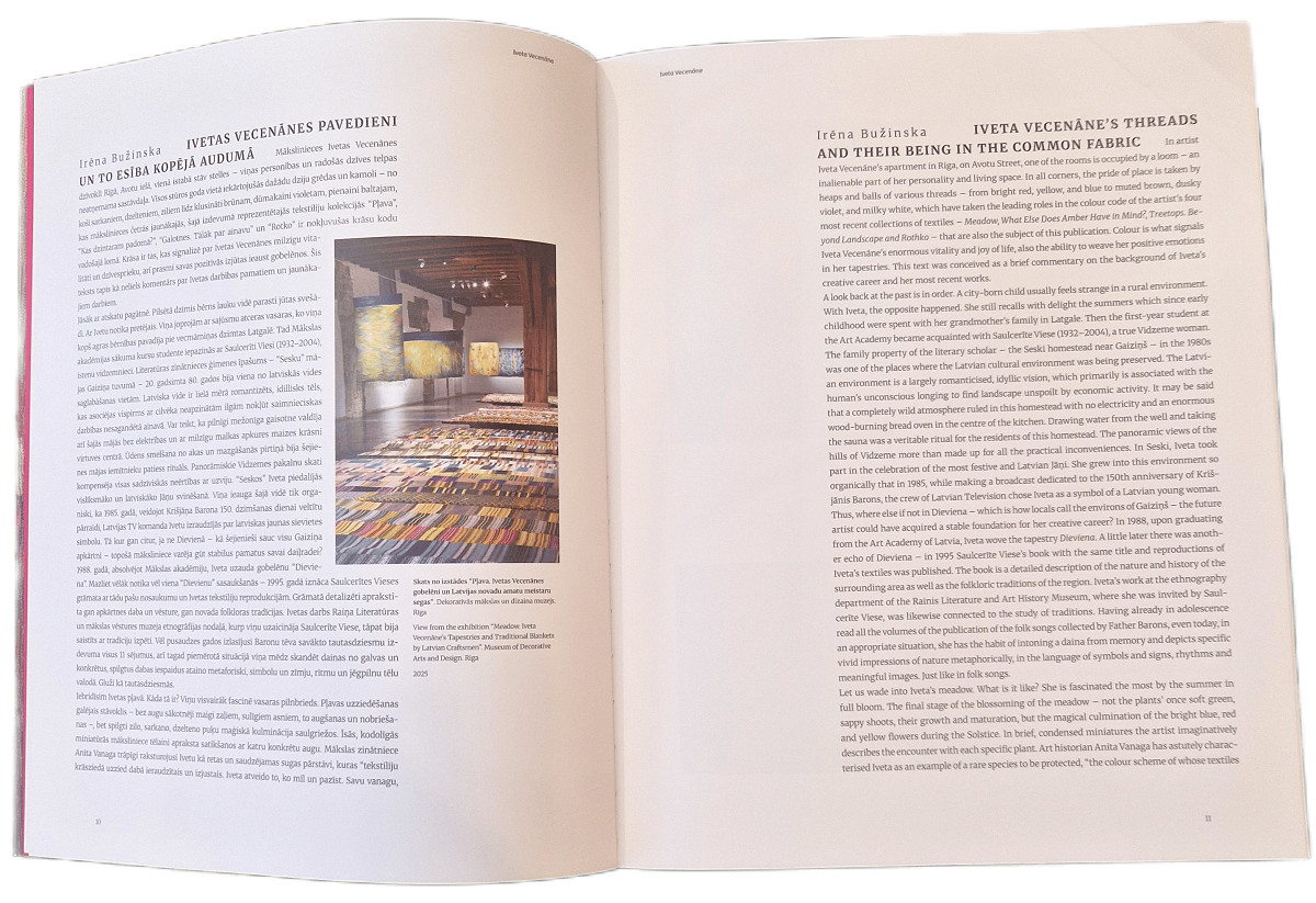 Mākslinieces Ivetas Vecenānes dzīvoklī Rīgā, Avotu ielā, vienā istabā stāv stelles - viņas personības un radošas dzīves telpas neatņemamā sastāvdaļa. Visos stūros goda vietā iekārtojušās dažādu dziju grēdas un kamoli-no koši sarkaniem, dzelteniem, ziliem līdz klusināti brūnam, dūmakaini violetam, pienaini baltajam, kas mākslinieces četrās jaunākajās, šajā izdevumā reprezentētajās tekstiliju kolekcijas "Plāva" "Galotnes. Tālāk par ainavu’ un "Rotko" ir nokļuvušas krāsu kodu "Kas dzintaram padomā?", vadošajā lomā. Krāsa ir tas, kas signalizē par Ivetas Vecenānes milzīgu vitalitāti un dzīvesprieku, arī prasmi savas pozitīvās izjūtas ieaust gobelēnos. Šis teksts tapis kā neliels komentārs par Ivetas darbības pamatiem un jaunākajiem darbiem Jāsāk ar atskatu pagātnē. Pilsētā dzimis bērns lauku vidē parasti jūtas sveša- di. Ar Ivetu notika pretējais. Viņa joprojām ar sajūsmu atceras vasaras, ko viņa kopš agras bērnības pavadīja pie vecmāmiņas dzimtas Latgalē. Tad Mākslas akadēmijas sākuma kursu studente iepazinās ar Saulcerīti Viesi (1932-2004), īstenu vidzemnieci. Literatūras zinātnieces ģimenes īpašums - "Sesku" mājas Gaiziņa tuvumā - 20. gadsimta 80. gados bija viena no latviskās vides saglabāšanas vietām. Latviska vide ir lielā mērā romantizēts, idillisks tēls. kas asociējas vispirms ar cilvēka neapzinātām ilgām nokļūt saimnieciskas darbības nesagandētā ainavā. Var teikt, ka pilnīgi mežonīga gaisotne valdīja arī šajās mājās bez elektrības un ar milzīgu malkas apkures maizes krāsni virtuves centrā. Ūdens smelšana no akas un mazgāšanās pirtiņā bija šejienes mājas iemītnieku patiess rituāls, panorāmiskie Vidzemes pakalnu skati kompensēja visas sadzīviskās neērtības ar uzviju. "Seskos" Iveta piedalījās vislīksmāko un latviskāko Jāņu svinēšanā. Viņa ieauga šajā vidē tik organiski, ka 1985, gadā, veidojot Krišjāņa Barona 150. dzimšanas dienai veltītu pārraidi, Latvijas TV komanda Ivetu izraudzījās par latviskas jaunas sievietes simbolu. Tā kur gan citur, ja ne Dievienā - kā šejienieši sauc visu Gaiziņa apkārtni - topošā māksliniece varēja gūt stabilus pamatus savai daiļradei? 1988. gadā, absolvējot Mākslas akadēmiju, Iveta uzauda gobelēnu Dieviena". Mazliet vēlāk notika vēl viena "Dievienu" sasaukšanās - 1995. gādā iznāca Saulcerītes grāmata ar tādu pašu nosaukumu un Ivetas tekstiliju reprodukcijām. Grāmatā detalizēti aprakstīta gan apkārtnes daba un vēsture, gan novada folkloras tradīcijas. Ivetas darbs Raina Literatūras un mākslas vēstures muzeja etnogrāfijas nodaļā, kurp viņu uzaicināja Saulcerīte Viese tāpat bija saistīts ar tradīciju izpēti.