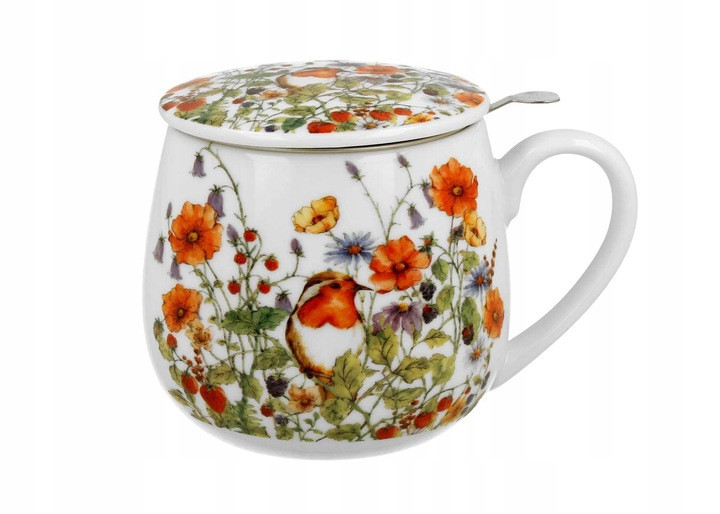 - mākslinieciskais dizains - dekorācijā attēloti krāsaini ziedi, galvenokārt magones, un starp tiem gudrs putns. Dzīvības pilna pļava piešķir krūzei unikālu raksturu, kas iepriecinās gan mājsaimniecības locekļus, gan viesus. Pavasara ziedu intensīvās krāsas padara katru tējas malku par atelpas un relaksācijas brīdi,