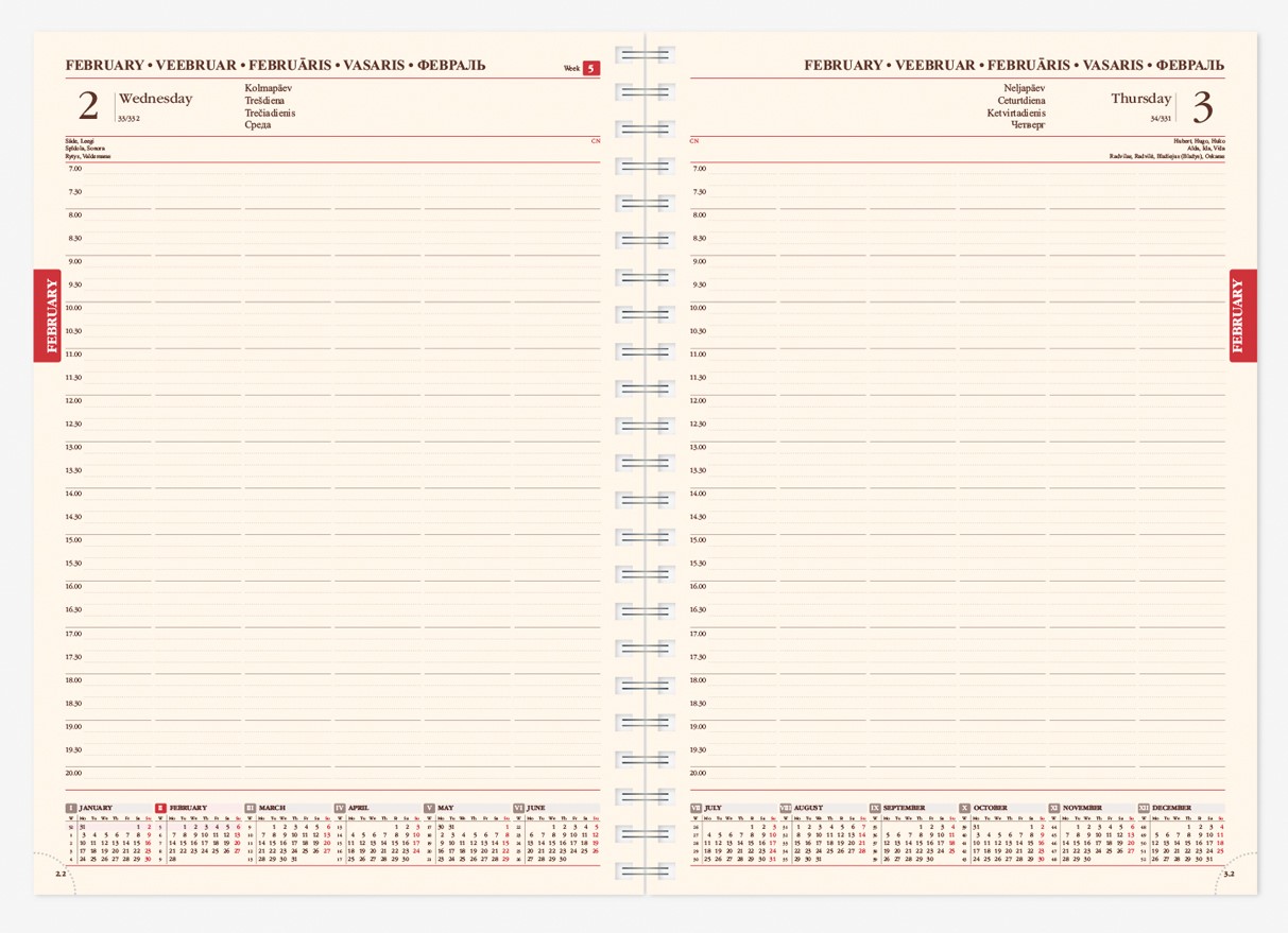 Lapas izmērs: 21.0 x 29.7 cm Valodas: Latviešu, lietuviešu, igauņu, angļu un krievu Papildus informācija: PVC vāks, ar spirāli, perforēti noplēšami lapu stūrīši Papildus apdrukas iespējas: Logo uzspiedums Apraksts: Visos plānotājos SENATOR ir tabulas kalendārs, gada plāns, viena diena lappusē, laiks no 07.00 līdz 20.00, nedēļu numerācija, valsts svētku un atzīmējamās dienas, vārda dienas, 38 citu valstu svētku dienas, norādīta pāreja uz vasaras un ziemas laiku, kontaktu un piezīmju lapas. Satura bloks plānotājiem: Senator Spirex