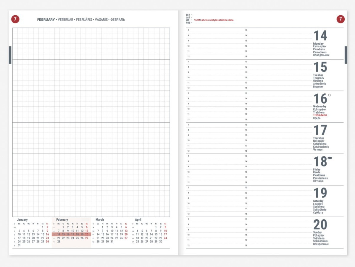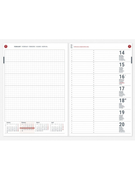 Valodas: Latviešu, lietuviešu, igauņu, angļu un krievu Papildus informācija: Mākslīgās ādas vāks, vārda dienu saraksts alfabētiskā secībā Papildus apdrukas iespējas: Zeltīti vai sudraboti stūrīši, logo un/vai vārda uzspiedums Apraksts: Plānotājos UNIKA ir gada plāns, nedēļu numerācija, viena nedēļa atvērumā, piezīmju lapa katrai nedēļai, valsts svētku un atzīmējamās dienas, mēness fāzes, zodiaka zīmju maiņas dienas.