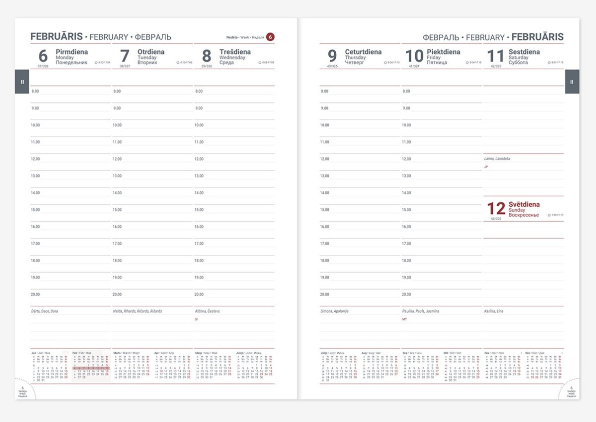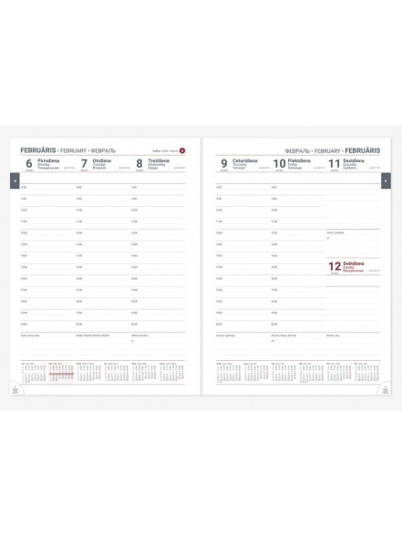 Lapas izmērs: 20.0 x 27.0 cm Valodas: Latviešu, angļu un krievu Papildinformācija: Polsterēti mākslīgās ādas vāki, grāmatzīme, cietais sējums, perforēti noplēšami lapu stūrīši Papildus apdrukas iespējas: Zeltīti vai sudraboti stūrīši, logo un/vai vārda uzspiedums Apraksts: Visos plānotājos VIP ir tabulas kalendārs, gada plāns, viena nedēļa atvērumā, laiks no 08.00 līdz 20.00, nedēļu numerācija, valsts svētku un atzīmējamās dienas, karogu dienas, vārda dienas, 38 citu valstu svētku dienas, norādīta pāreja uz vasaras un ziemas laiku, gadalaiku sākums, saullēkta un saulrieta laiki, mēness fāzes, zodiaka zīmju maiņas dienas, kontaktu un piezīmju lapas. Krāsas: Melns Tumši zils Pelēks Bordo Tumši zaļš Gaiši violets