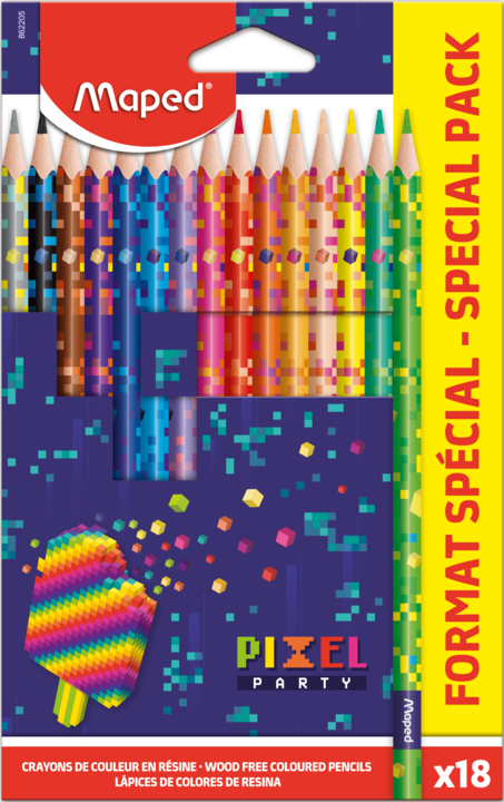 MAPED "Pixel Party" trīsstūrveida krāsu zīmuļi ērtākai satveršanai. Zīmuļi ir spilgtās krāsās un tie ir viegli asināmi.To sastāvā ir 0% koka. Standarta serdeņa diametrs 2,9 mm. Kolekcija ar pikseļu dizainu, kura patiks bērniem un pusaudžiem! "Pixel Party" kolekcijas sortiments piedāvā plašu skolas piederumu klāstu, kurš nodrošinās Jūsu bērniem krāsainu un aizraujošu mācību procesu no sākumskolas līdz vidusskolai.