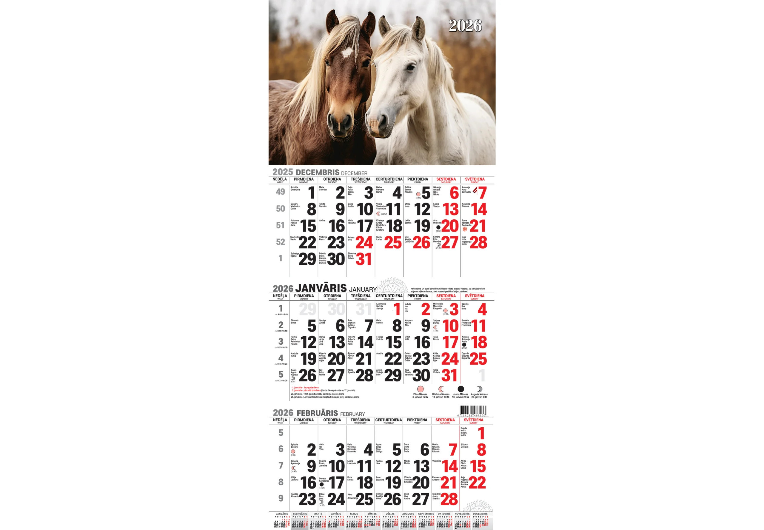 Augstas kvalitātes kalendārs ar košu Gada bildi, ērti noplēšamām lapām, kursonu dienu atzīmēšanai, lieliem, skaidriem cipariem, nedēļu skaitu.