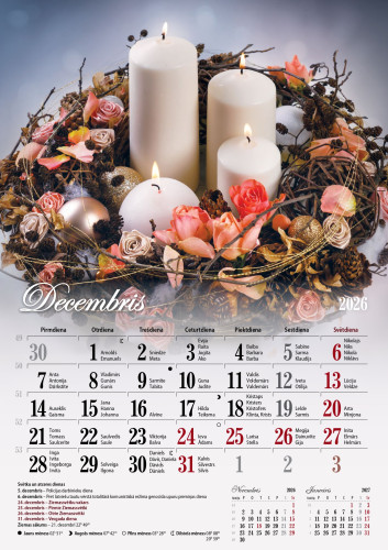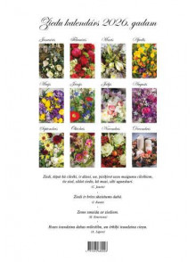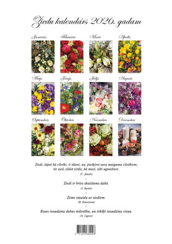 Ziedi sienas kalendārs - elegants un praktisks veids, kā iekrāsot ikdienu. Kalendārs ar izmēru 24 x 34 cm un ērtu spirāli augšpusē būs viegli pieliekams pie sienas un ērti pāršķirams. Pilnkrāsu druka un biezs, glancēts krītots papīrs ( vāks - 250g/m2, iekšlapas - 170g/m2) izceļ katru no 12 unikālajām ziedu kompozīcijām. Katrs mēnesis pārsteidz ar jaunu ziedu noskaņu - no pavasara svaiguma līdz košiem vasaras toņiem un mierpilniem rudens akcentiem.