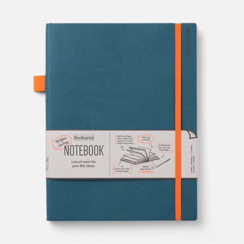 Dažreiz jums vienkārši ir nepieciešams nedaudz vairāk vietas. Dažreiz jums šķiet, ka rakstāt visos vāciņos vai skribelē savā sliktākajā rokrakstā. Bigger Things Notebook ir ļoti jauks izmērs, ko turēt, nēsāt un lietot, ar izklātām lapām un īpaši mīkstu un elastīgu mākslīgās ādas vāku. Tam ir visas parastās parocīgās Bookaroo piezīmju grāmatiņas funkcijas, taču šim modelim mēs esam pievienojuši pareiza izmēra kabatu aizmugurē papīra gabaliem, kurus vēlaties saglabāt, un ērtu pildspalvas cilpu. Tik daudz iespēju! Sāciet jaunu biznesu. Uzrakstiet grāmatu.