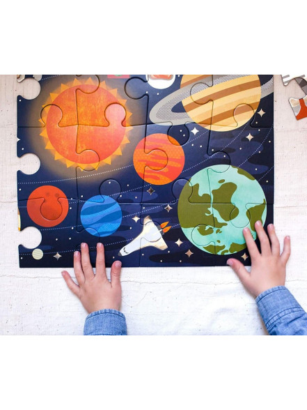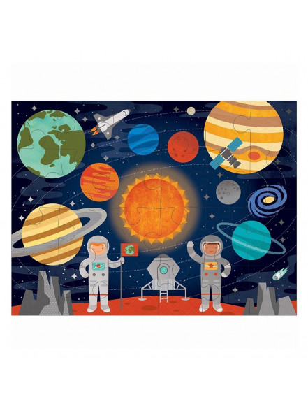 Šī būs brīnišķīga nākamā puzlīte, lai iepazītu pcitas planētas un zvaigznes. 24 liela formāta gabaliņi veido 45x60 cm lielu stingra materiāla attēlu ar nakts debesīm un planētām. Drukāta uz pārstrādātā kartona ar netoksiskām augu izcelsmes krāsām. Arī kārbiņa, kura būs lielisks iesaiņojums dāvanai un puzlītes uzglabāšanai. Kokvilnas aukliņas rokturītis. Šis produkts ir radīts, paturot prātā mūsu bērnu un planētas veselību.
