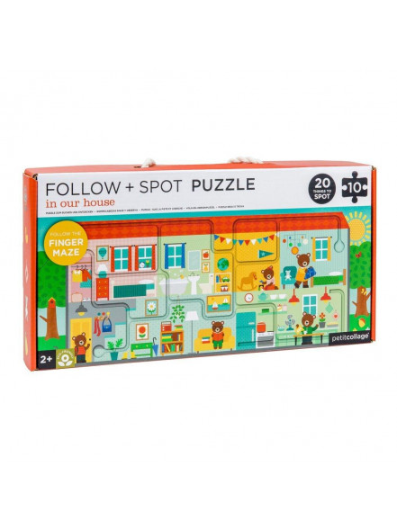 Šīs ir brīnišķīgas mācību puzlītes - attēls jāsaliek no 10 gabaliņiem, kas būs pa spēkam arī divgadniekam. Attēls ir veidots ar reljefu taciņu pirkstiņam vai šajā reizē mazajam lācēnam, kuram cauri visai mājai jānonāk gultiņā. Pirkstiņš seko taciņu labirintiem un tā var izstaigāt visu māju un iepazīt dažādas lietas tajā. Uz kastes ir norādīti arī 20 dažādi objekti, kurus bērnam ir mērķtiecīgi jāatrod ceļā pa taciņām raibajā lāču mājā. Lieliski attīstīs vizuālo uztveri, sīko motoriku, valodas prasmi, jo šeit patiešām ir ļoti daudz ko pārrunāt - kā vesela bilžu grāmata. Puzle drukāta uz pārstrādāta papīra ar augu izcelsmes krāsām.