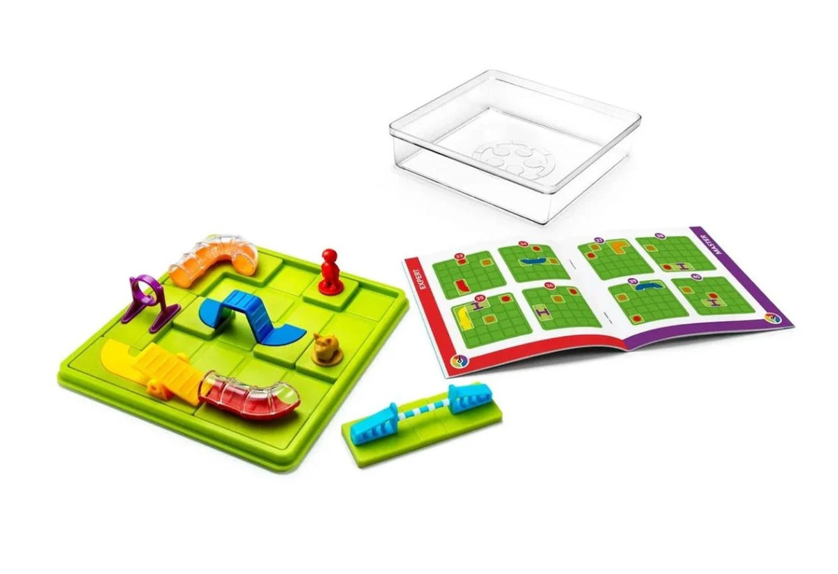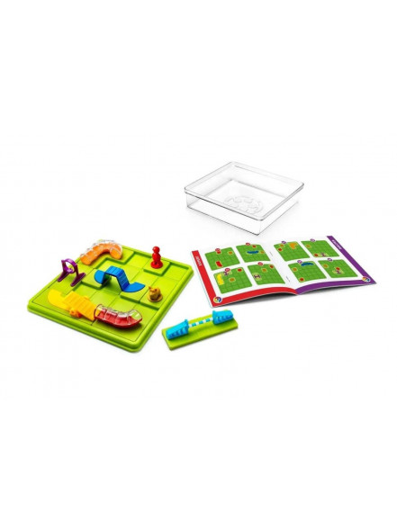 Novietojiet spēles figūriņas, kā parādīts rokasgrāmatā, un pievienojiet pārējos šķēršļus spēles laukumam, lai izveidotu ceļu starp suni un suņu dresētāju. Maršrutam jāiet cauri visiem šķēršļiem.