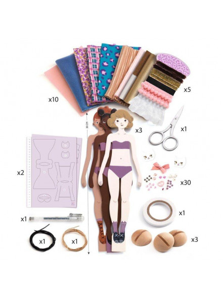 Radošais komplekts topošajiem stilistiem. Ietērp lellītes stilīgos apģērbos. Sekojot dotajām instrukcijām, piegriez un izveido dažādus modīgus tērpus, izmantojot īstu audumus. Komplektā ietilpst 3 lelles (25 cm) ar 3 koka pamatnēm, 10 dažādu krāsu un materiālu audumi, 5 lentītes, 2 elastīgas auklas, pērlītes un nelieli aksesuāri, šķēres, abpusējā līmlente, pildspalva un 2 lapas ar piegrieztnēm. Ievads modes dizainā bez adatām un šūšanas. Piemērots bērniem no 7 līdz 12 gadu vecumam. Brīdinājums! Nav piemērots bērniem, kas jaunāki par trim gadiem, satur sīkas detaļas, pastāv aizrīšanās risks.