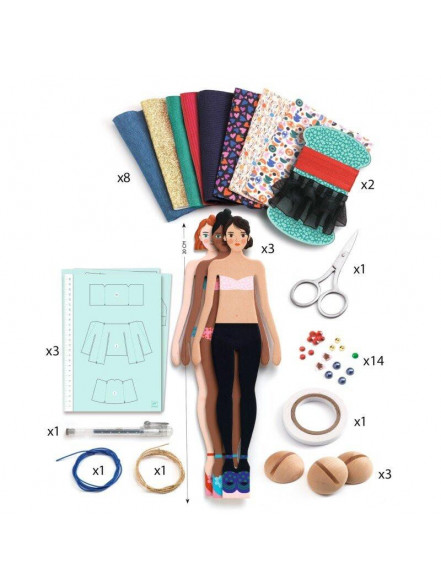 Radošais komplekts topošajiem stilistiem. Ietērp lellītes stilīgos apģērbos. Sekojot dotajām instrukcijām, piegriez un izveido dažādus modīgus tērpus, izmantojot īstu audumus. Komplektā ietilpst 3 lelles (25 cm) ar 3 koka pamatnēm, 8 dažādu krāsu un materiālu audumi, 2 lentītes, 2 elastīgas auklas, pērlītes un nelieli aksesuāri, šķēres, abpusējā līmlente, pildspalva un 3 lapas ar piegrieztnēm. Ievads modes dizainā bez adatām un šūšanas. Piemērots bērniem no 7 līdz 12 gadu vecumam.