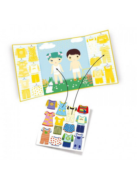Biezas un viegli noņemamas vinila uzlīmes pašiem mazākajiem. Izvieto uzlīmes uz pamatnes, lai papildinātu doto attēlu un ietērptu tēlus dažādos apģērbos! Maini uzlīmes vietām, cik bieži vien vēlies! Komplektā ietilpst pamatne ar ilustrācijām (43 x 23 cm) un 1 lapa ar 14 daudzreiz lietojamām uzlīmēm. Uzlīmes pēc lietošanas var ērti izvietot pamatnes sānos, kur katrai uzlīmei paredzēta atbilstošas formas vieta.