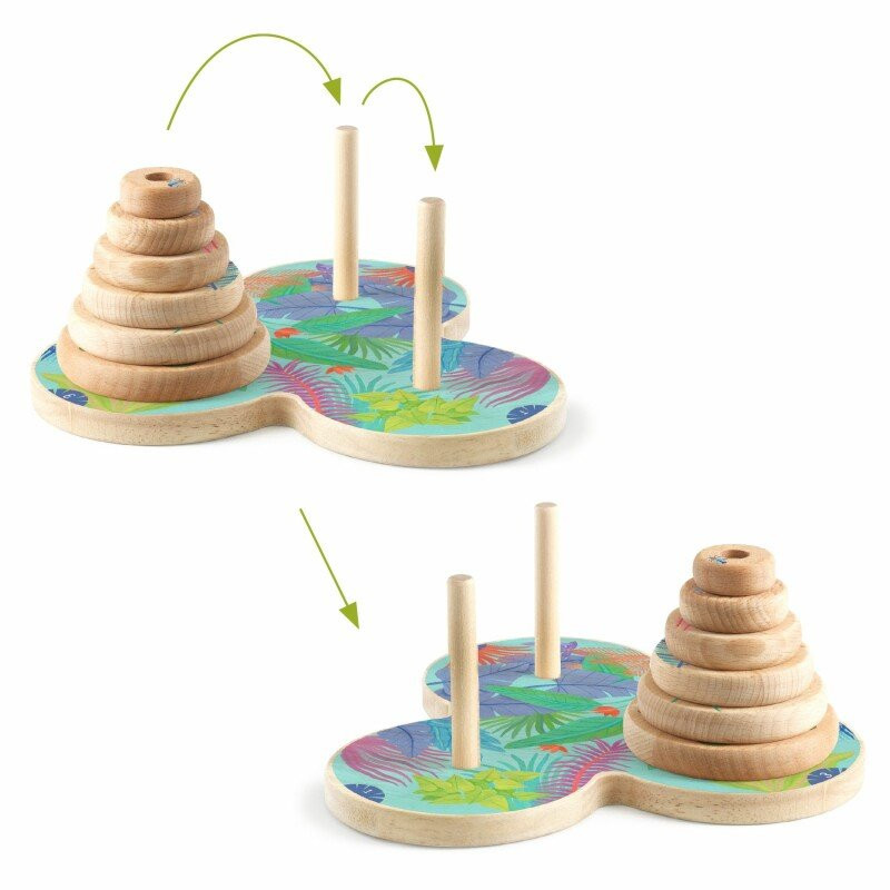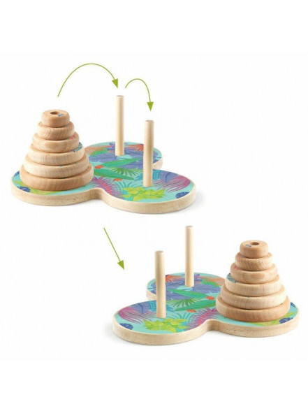 Klasiska spēle unikālā Djeco dizainā. Hanojas tornis ir matemātiska mīkla, kas veicina stratēģisko domāšanu un loģisko spriešanu. Spēlējot šo spēli, bērni kļūst uzmanīgāki, kā arī uzlabojas viņu koncentrēšanās spējas un problēmu risināšanas prasmes. Komplektā ietilpst spēles pamatne un 6 koka diski dažādos izmēros. Spēles mērķis ir pārvietot visu piramīdu no pirmā kociņa uz pēdējo kociņu, taču tas nebūt nav tik viegli, jo jāievēro tālāk norādītie noteikumi: 1. Katrā gājienā spēlētājam jānoņem augšējais disks no vienas no riņķu kaudzītēm (piramīdām) un jānovieto tas uz kādas citas kaudzītes augšējā riņķa vai jānoliek uz tukša kociņa, ja tāds ir pieejams. 2. Vienlaikus drīkst pārvietot tikai vienu riņķi jeb disku. 3. Riņķi, kas tiek pārvietots, nedrīkst nolikta uz mazāka riņķa.