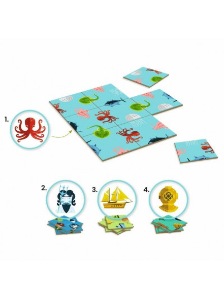 Kabatas izmēra loģikas spēle vienam spēlētājam, kuru var ērti paņemt līdzi dažādos izbraukumos. Izmantojot domino principu, liec kopā gabaliņus un atveido 4 uzdevumu puzles. Puzlēm ir 4 dažādi grūtības līmeņi un tikai viens atrisinājums. Izmantojot detaļas, salieciet puzli. Detaļu malās atrodas dažādi attēli, kas ir sadalīti uz pusēm. Liekot puzli, šo attēlu puses ir jāsavieno tā, lai veidotos pilns attēls. Tikai attēli, kas atrodas puzles malās, paliks nesavienoti un nepabeigti. Saliktajai puzlei jābūt 3 x 3 kvadrāta formā. Katram uzdevumamKomplektā ietilpst 4 puzles, kas katra sastāv no 9 gabaliņiem, un instrukciju buklets. Bukleta beigās ir norādīti pareizie atrisinājumi. Attīsta pacietību un loģisko domāšanu.