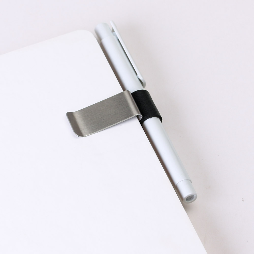 Elegants rakstāmrīku turētājs zelta vai sudraba krāsā ar ādas stiprinājumu. Piezīmju grāmatai vai plānotājam vienmēr blakus būs arī jūsu iemīļotais rakstāmrīks.