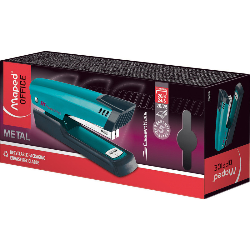 Степлер ESSENTIALS METAL DECO с коротким магазином на 25 листов. В коллекцию Deco входят степлеры, перфораторы и канцелярские ножницы бирюзового, бордового и черного цветов. Прочный и функциональный. Богато оснащенный, он отвечает ожиданиям самых требовательных пользователей. Для повседневного использования дома и в офисе. Прочная металлическая конструкция. Металлический механизм. Закрытая и обивочная строчка. Верхняя загрузка. Он открывается на 180 градусов. Индикатор количества скоб. Глубина сшивания 61 мм. Емкость магазина: 100 скоб 24/6 или 140 скоб 26/6.