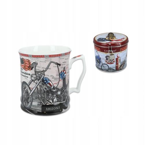 Iepakojums: Katra krūze tiek ievietota skārda kastē ar grafiku par leģendāriem motocikliem. Tas ir iepakojums, kas padara krūzi un krūzi tik īpašu.