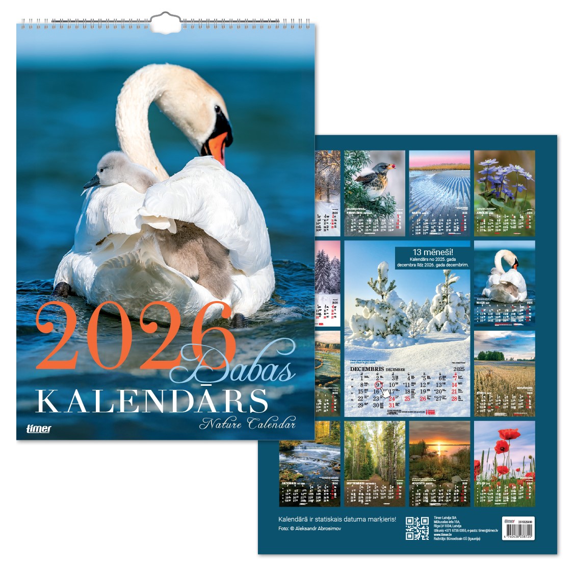 Kalendārā ir valsts svētku un atzīmējamās dienas, karogu dienas, vārda dienas, nedēļu numerācija, norādīts gadalaiku sākums, saullēkta un saulrieta laiki, zodiaka zīmju maiņas dienas. Kalendārs ir ar spirāli, tam ir cilpa pakarināšanai pie sienas, iekļauts statiskais datuma marķieris. Katra mēneša atvērumā var redzēt iepriekšējo un nākošo mēnesi.