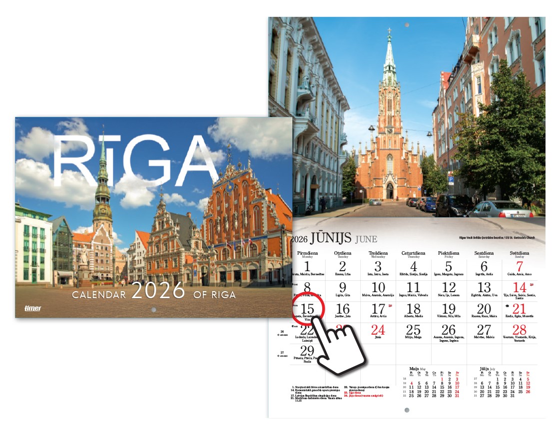 Kalendārā atzīmētas valsts svētku un atzīmējamās dienas, karogu dienas, vārda dienas, nedēļu numerācija, norādīts gadalaiku sākums, saullēkta un saulrieta laiki, mēness fāzes, zodiaka zīmju maiņas dienas.