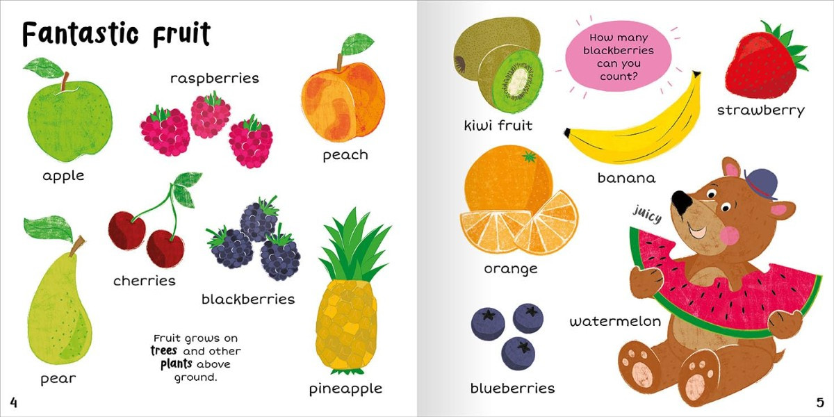 Young children will love exploring their world with this helpful book of first food words. Pages are organised into different themes relating to the world of food, and are packed with words and illustrations to talk about. Engaging questions are scattered around the pages to encourage inquisitive toddlers to interact with the book. There is a fun can you find activity on the last page, with prompts to find objects within the book.