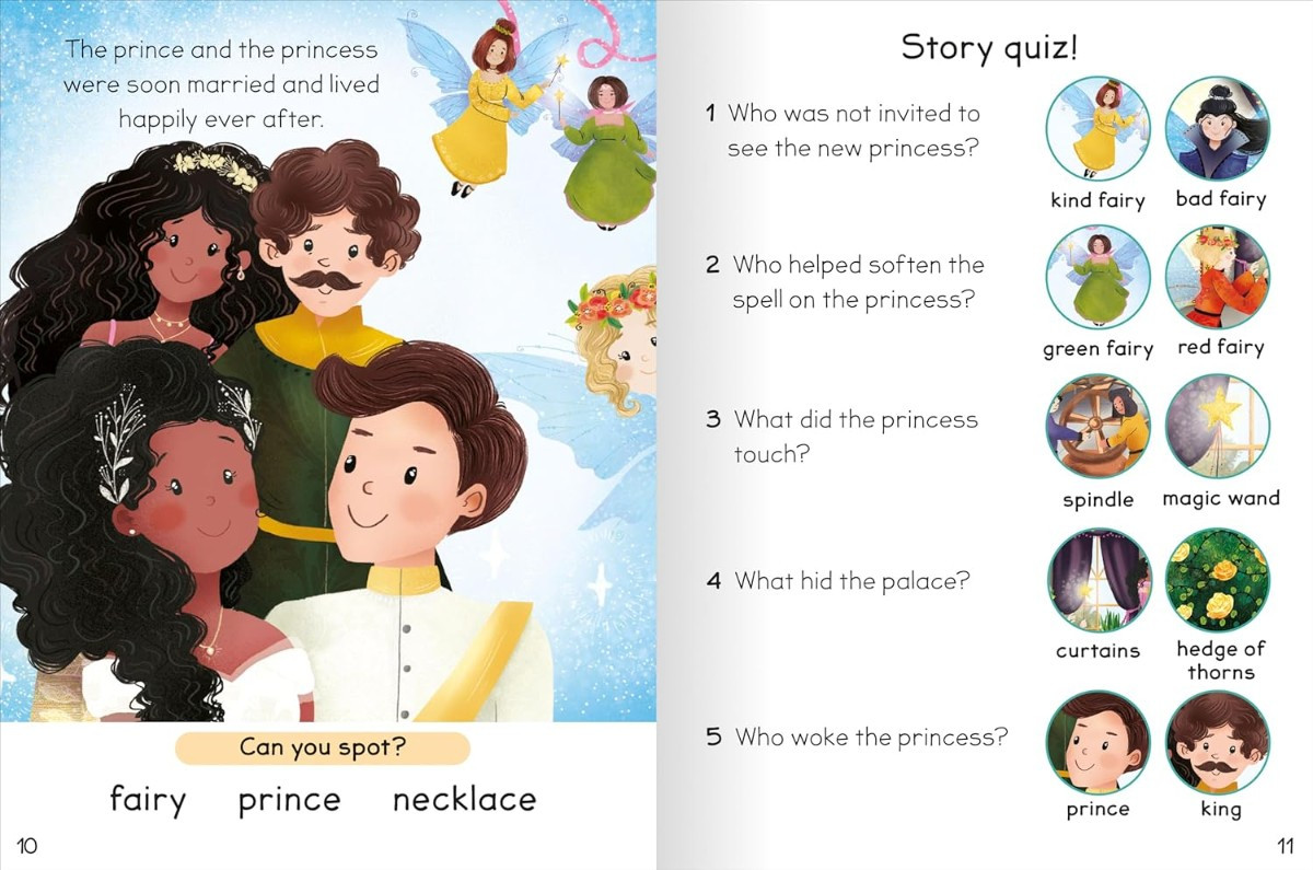 This activity storybook is perfect for early readers. Each page has a ‘Read along’ and ‘Can you spot?’ section to help the reader understand the story and strengthen their reading skills. At the end there is a retelling activity, a picture quiz, a rhyming words task and a picture dictionary, plus a sheet of reward stickers to help children build confidence in their reading skills. • Great for early reading skills • Encourages reading comprehension with quiz questions, a picture dictionary, a rhyming words task and a retelling activity • Uses the familiar classic fairy tale Sleeping Beauty • Includes a sheet of reward stickers to help instil confidence in young readers