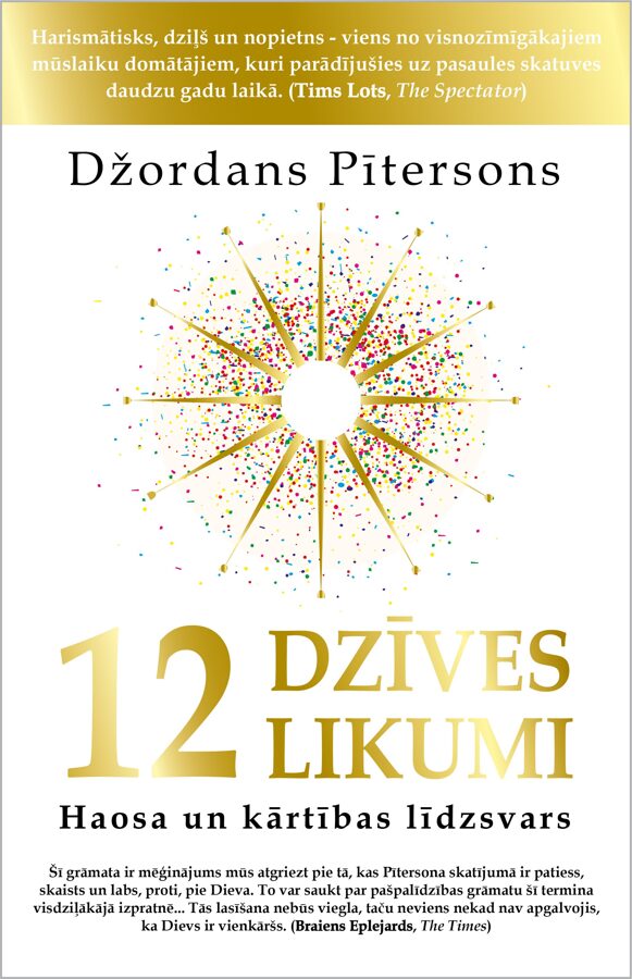 12 DZĪVES LIKUMI ir divpadsmit vienkāršas dzīves patiesības, viedi eksistences likumi, kas apgāž vispārpieņemtus uzskatus un veldzē lasītāja dvēseli un prātu. Meistarīgi savijot seno domātāju atziņas, literatūras dižgaru domugraudus un mūsdienu zinātnes un filosofijas atklāsmes, Dž. Pītersons šajā grāmatā atbild uz vissarežģītākajiem jautājumiem par to, kā iekārtota pasaule.